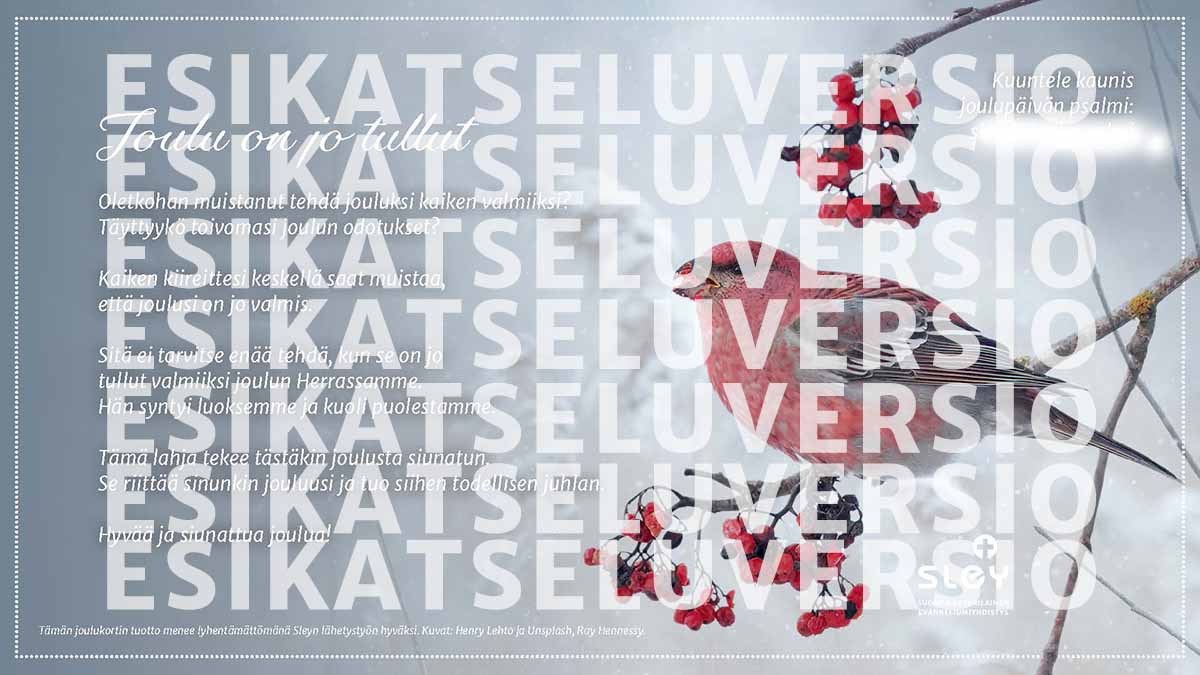 Ostoksesi jälkeen saat joulukortin PDF-tiedostona sähköpostiisi. Voit lähettää sen niin monelle kuin haluat. Joulukortissa on lyhyt pastori Olli Koskenniemen laatima hartaudellinen teksti, upea Henry Lehdon jouluinen luontokuva ja linkki Joakim Viljan äänittämään joulupsalmiin. Kortin on laatinut graafikko Saana Raunio, ja sen tuotto menee Sleyn lähetystyön hyväksi.